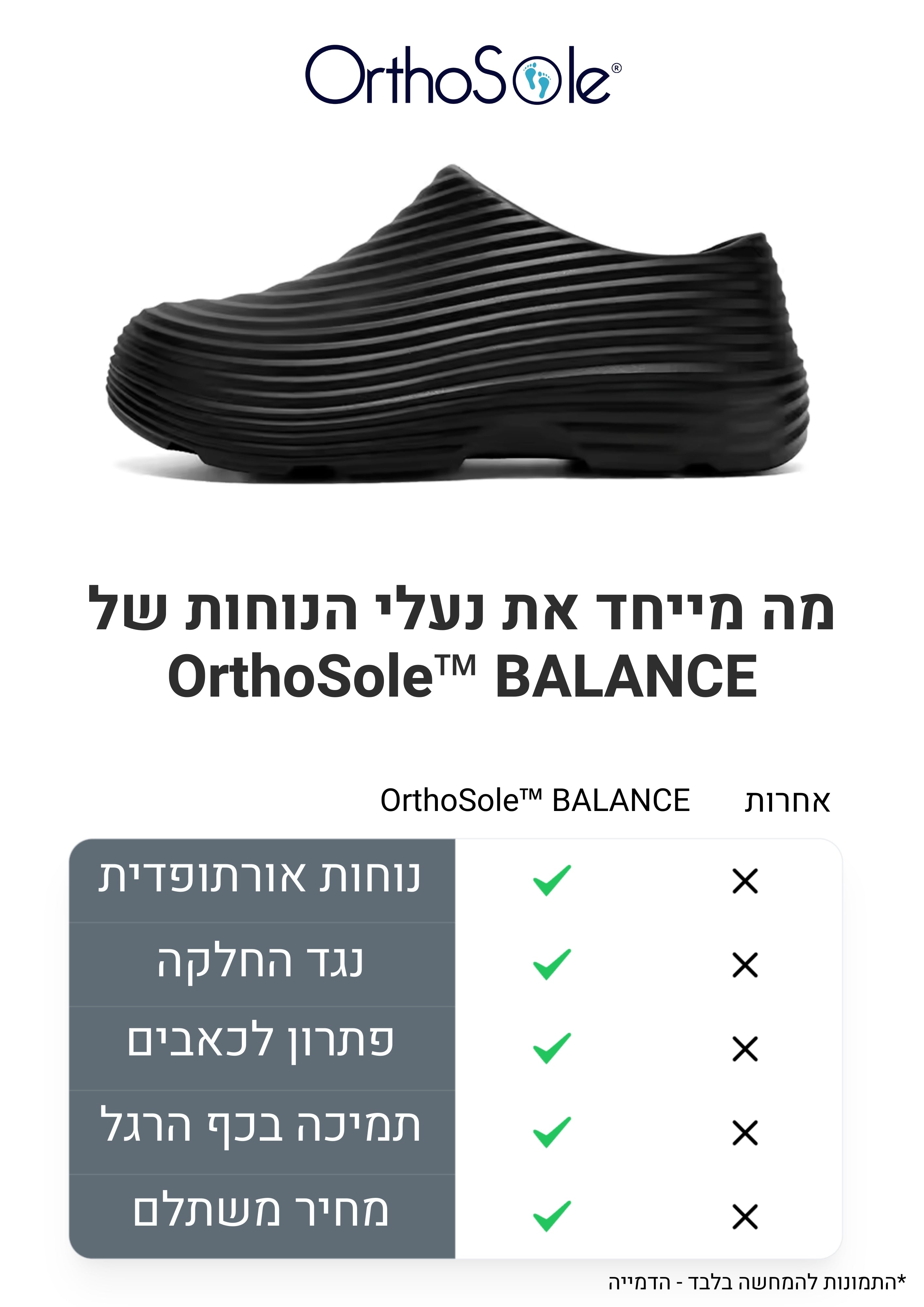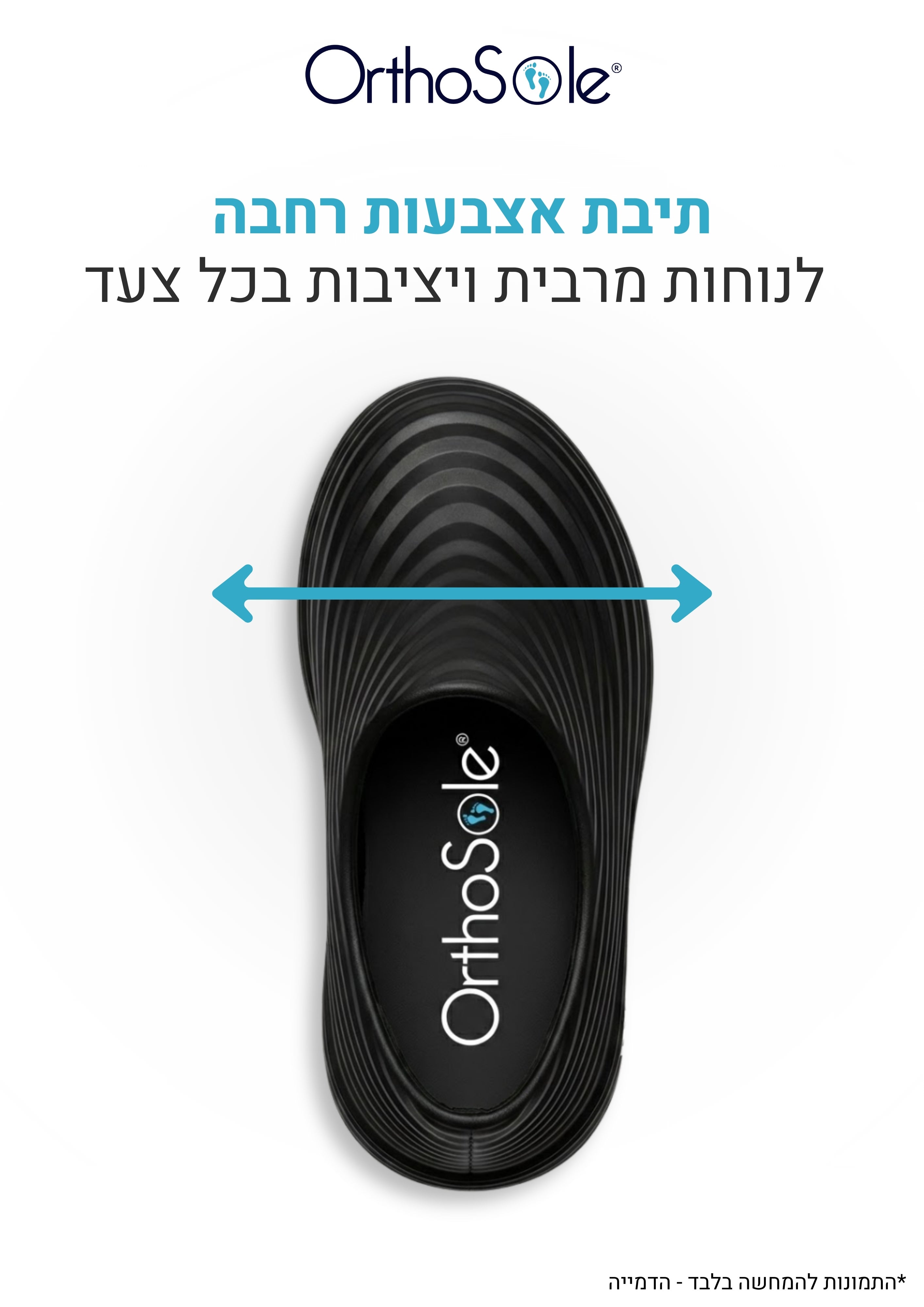 ופש במקום שבו האצבעות זקוקות לו ביותר קופסת האצבעות הרחבה מעוצבת בקפידה כדי לספק מרווח נדיב, להפחית לחץ ולאפשר נוחות לאורך כל היום. • מסייעת בהפחתת אי־נוחות הנגרמת מיבלות (בוניון), אצבע פטיש ונפיחות בכף הרגל • תומכת ביישור טבעי של האצבעות ובתנועה חופשית ללא הגבלה • מפחיתה חיכוך ולחץ הדוק העלולים לגרום לכאבים ועייפות במהלך שעות ארוכות על הרגליים