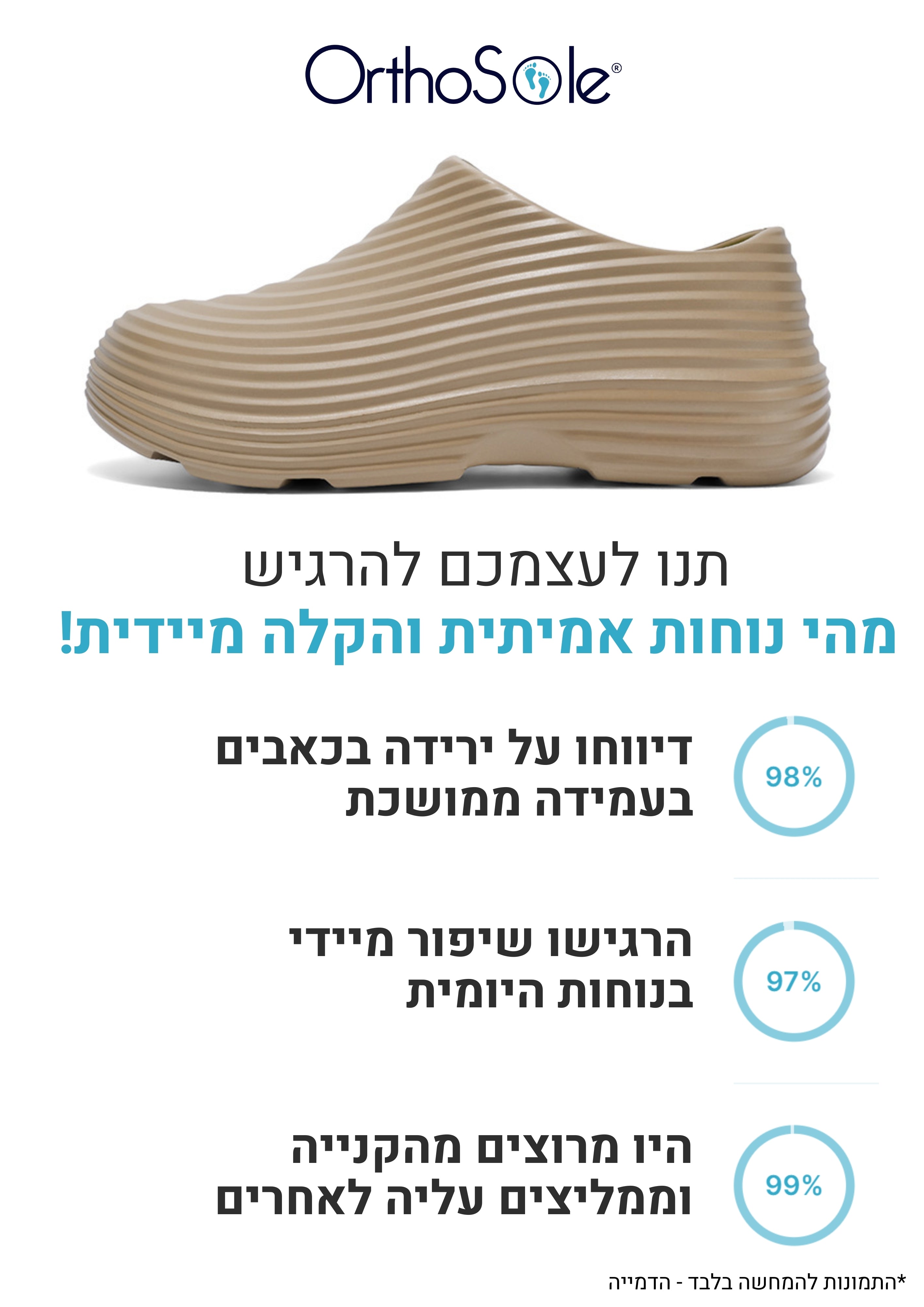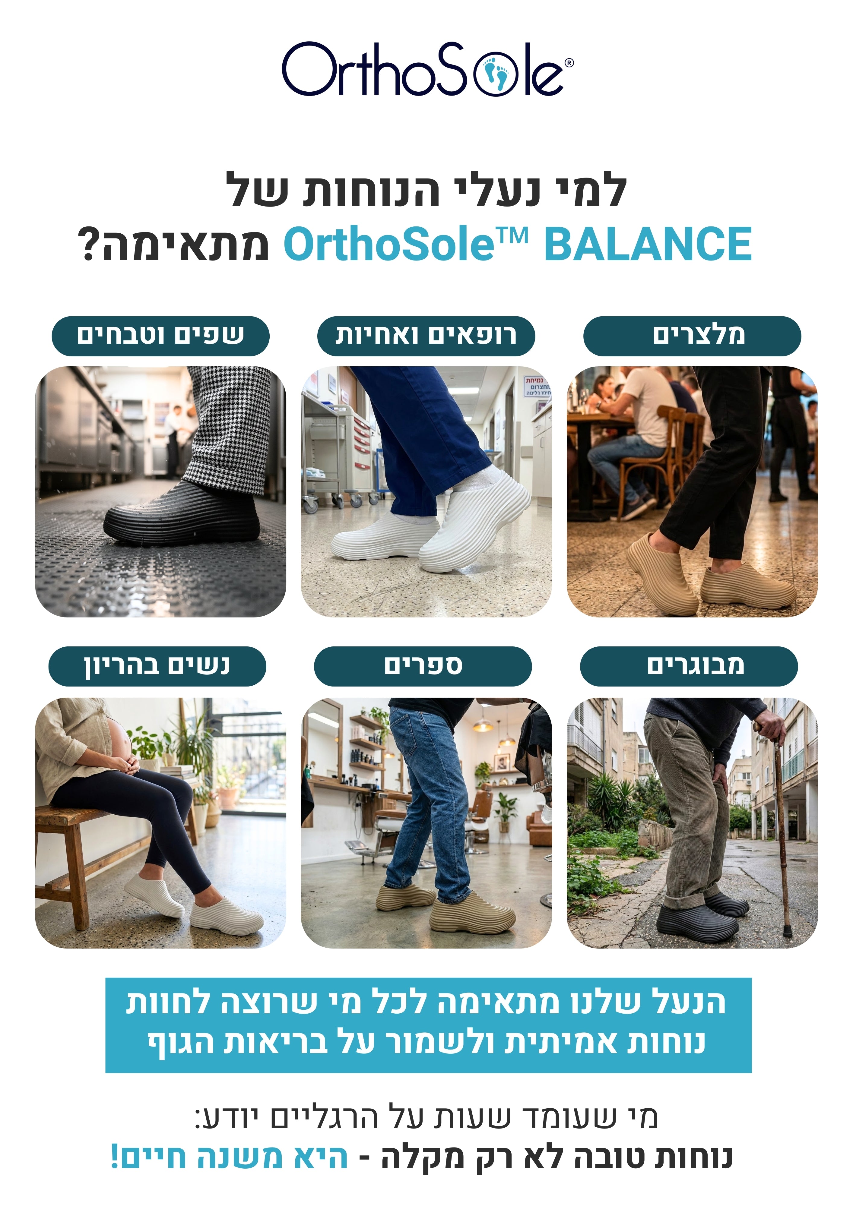 סוליה מונעת החלקה – אחיזה מלאה גם בתנאים קיצוניים נעלי OrthoSole GRIP מצוידות בסוליה מתקדמת לעבודה על משטחים רטובים, שמנוניים וחלקים – כשיציבות ובטיחות הן קריטיות. אחיזה חזקה על מים ושמן הסוליה מיוצרת מתרכובת גומי ייעודית בצפיפות גבוהה ומספקת חיכוך מצוין גם על רצפות רטובות ובסביבות עם שמן/שומן. מבנה ייעודי נגד החלקה תבנית דריכה עמוקה לשיפור האחיזה פינוי מהיר של מים ושמן מהמשטח מגע יציב ורציף עם הרצפה בכל צעד הפחתה משמעותית של סכנת החלקה מותאמת לסביבות עבודה תובעניות מתאימה במיוחד ל: מטבחים מקצועיים ומסעדות בתי מלון וקייטרינג מפעלים ותעשייה לוגיסטיקה ומחסנים סביבות רפואיות ורטובות יציבות וביטחון לאורך כל היום השילוב בין אחיזה גבוהה, בלימת זעזועים ופיזור עומסים נכון מעניק תחושת ביטחון בכל צעד – גם במשמרות ארוכות ובתנועה מהירה. עמידות לאורך זמן עמידות גבוהה לשחיקה שמירה על רמת אחיזה גם לאחר שימוש ממושך מותאמת למגע חוזר עם מים, שמן וחומרי ניקוי